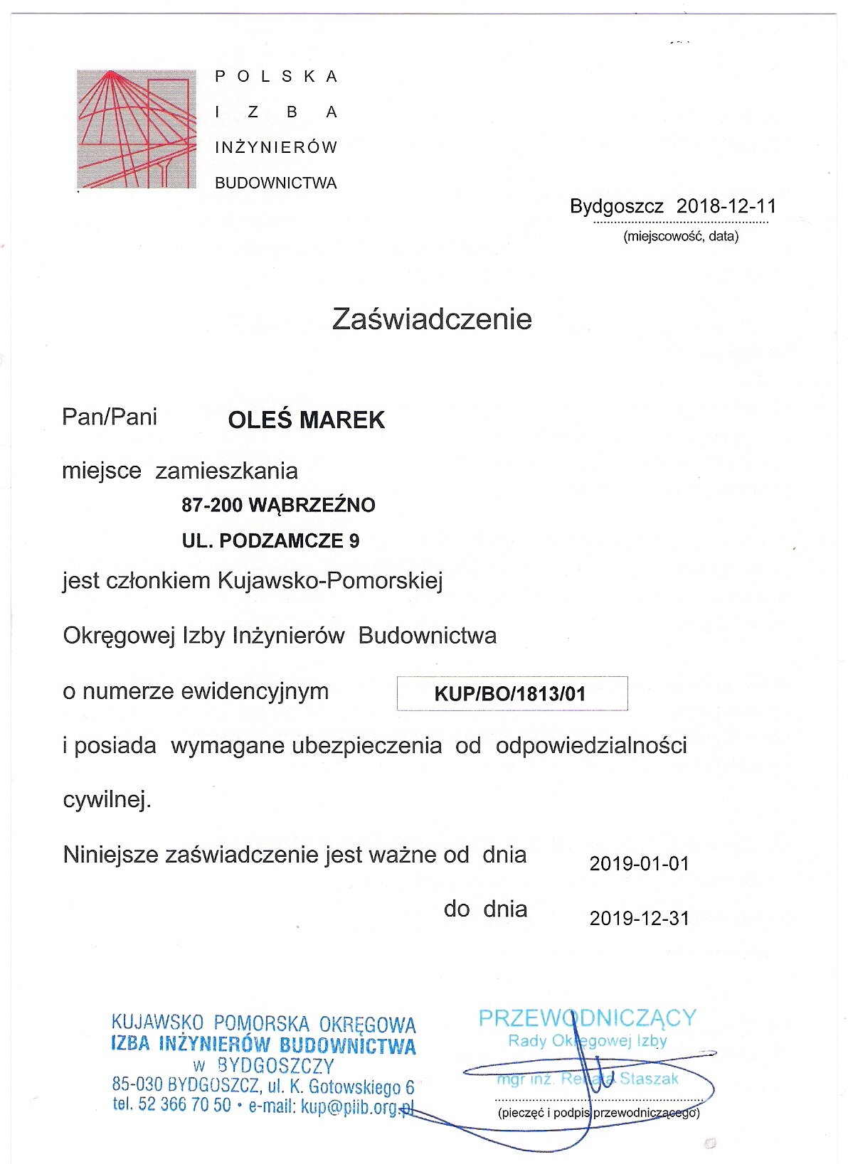 Zaświadczenie Izby Inżynierów Budownictwa
